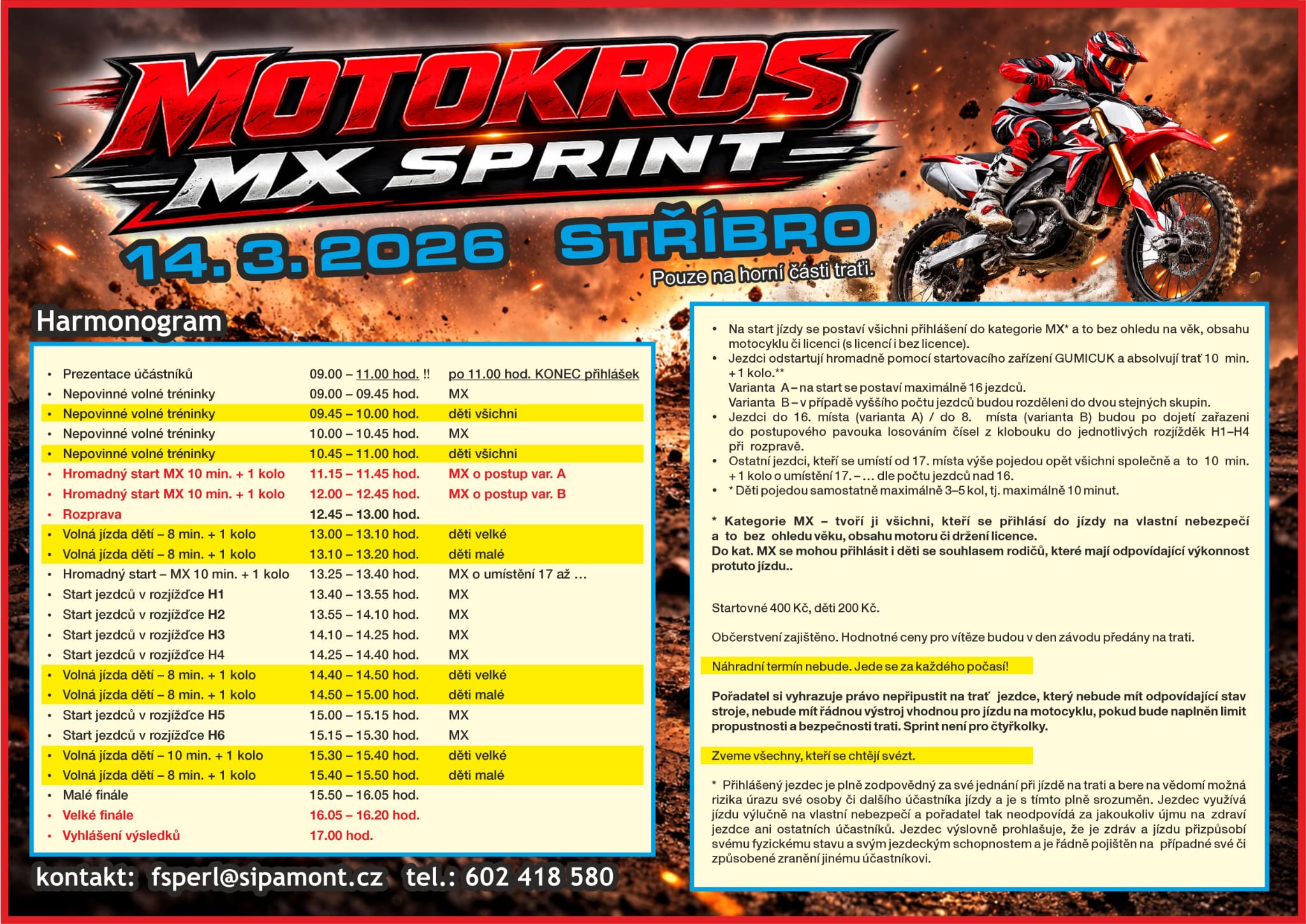 MX Sprint 14.3.2026 27.02.2026 00:00 V sobotu 14.3.2026 se ve Stříbře na Terénu sv. Petra na malém okruhu nad klubovnou koná 3. ročník MX Sprintu. Pořádá František Šperl, tel. 602418580. Plakát si do čitelné podoby rozkliknete přes modrý banner "Celý článek".